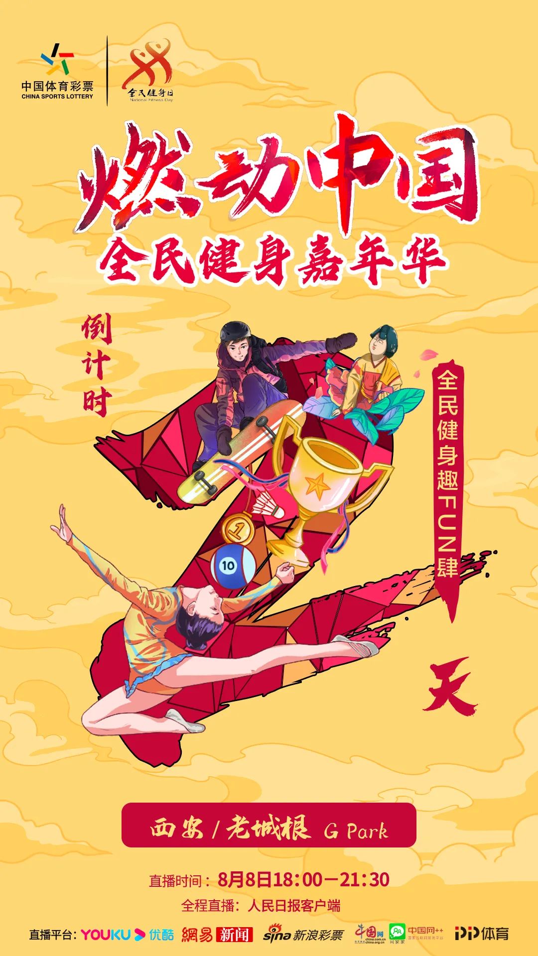 距离“燃动中国”全民健身嘉年华活动开始 还有2天 这是一场让你尽兴嗨玩的嘉年华活动 实力绽放,闪烁光芒 8月8日-8月9日 体彩和你一起相约在 西安老城根G park水晶广场 点“燃”你的运动细胞 共同点亮健康中国 8.8全民健身日 期待与你不见不散