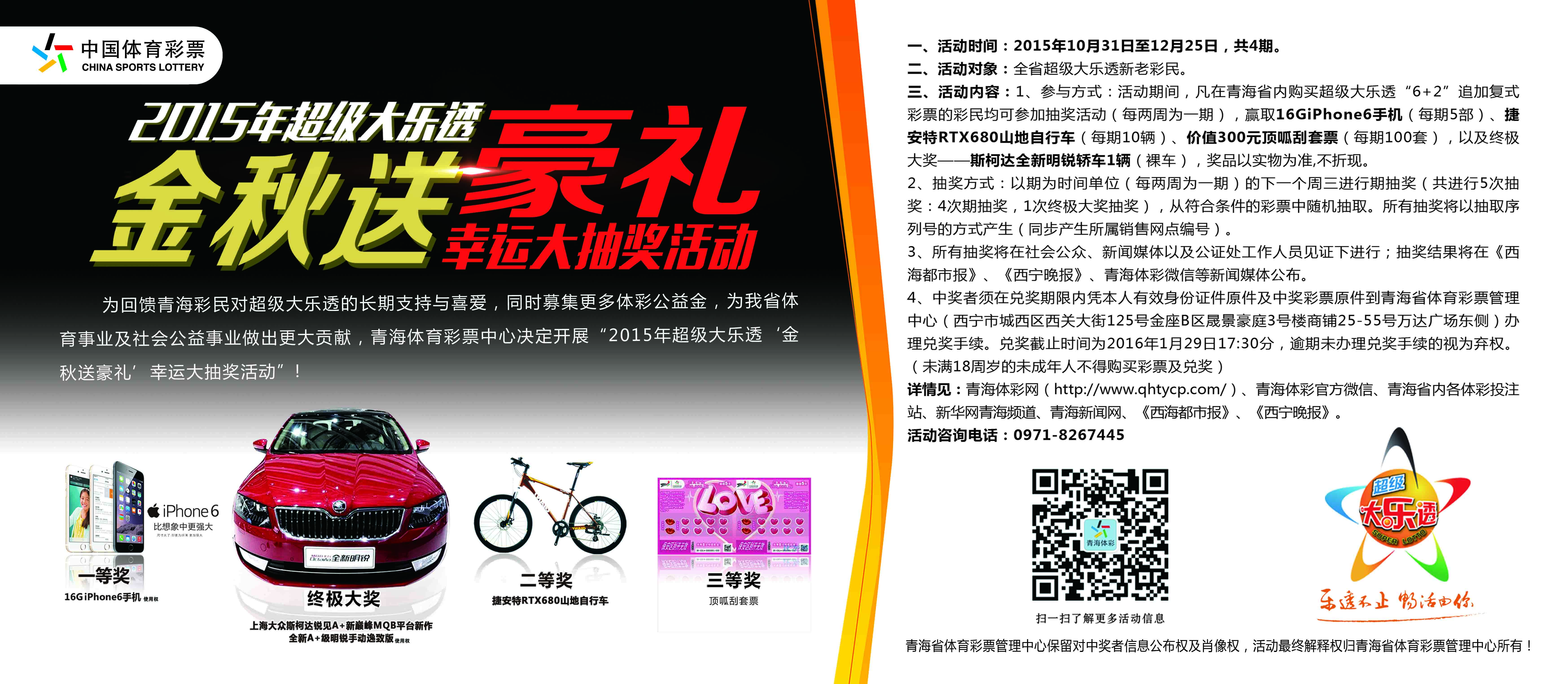 金秋十月,体彩大奖中不停,精彩与实惠更是纷纷来袭。青海省体育彩票管理中心为回馈我省彩民对超级大乐透多年的支持与喜爱,特推出2015年超级大乐透“金秋送豪礼”幸运大抽奖活动,为青海彩民送去更多惊喜与实惠。 活动时间 2015年10月31日至12月25日,共4期; 第一期:10月31日00:00时至11月13日24:00时(11月18日抽奖); 第二期:11月14日00:00时至11月27日24:00时(12月2日抽奖); 第三期:11月28日00:00时至12月11日24:00时(12月16日抽奖); 第四期:12月12日00:00时至12月25日24:00时(12月30日抽奖)。 参与办法 活动期间,凡在青海省内购买超级大乐透“6+2”追加复式彩票的彩民均可参加抽奖活,抽奖分为期奖和终极大奖。期奖每期抽取一次,奖品包括一等奖16GiPhone6手机一部(共20部,每期5部),二等奖捷安特RTX680山地自行车一辆(共40辆,每期10辆),三等奖价值300元的顶呱刮套票一套(共400套,每期100套),终极大奖则是一辆价值11.9万元的斯柯达轿车(裸车)。活动期间,只要在青海省内购买超级大乐透“6+2”追加复式彩票的彩民均可参与抽奖活动的彩民,就有机会将汽车开回家。 所有奖项从符合条件的彩票(数据经国家体育总局体彩中心数据机房数据库中调出)由电脑进行随机抽取。所有抽奖以抽取序列号的方式产生(同步产生所属销售网点编号)。本次活动秉承公平、公正、公开、透明的原则,活动全程在社会公众、新闻媒体、西宁恒源公证处的见证下进行。同时,抽奖全程将在有关媒体播出。 一张彩票三次中奖机会 活动期间,只要在青海省内购买超级大乐透“6+2”追加复式彩票就有三次中奖机会。即:一次大奖:在超级大乐透高奖池下,购“6+2”追加复式彩票有机会获得更多奖金。二次大奖:每张符合条件的彩票可参加一次期抽奖,可获得16GiPhone6、捷安特RTX680山地自行车或价值300元的顶呱刮套票。三次大奖:每张符合条件的彩票除参加一次期抽奖外,还可参与最后的终极大奖抽奖。 赶紧走进体彩投注站了解活动详情,或登录青海体彩官网(/),您也可以扫描以下二维码,关注青海体彩官方微信,随时了解活动的动态信息。大奖和豪礼已经准备好了,只等您的参与!(张丽丽)