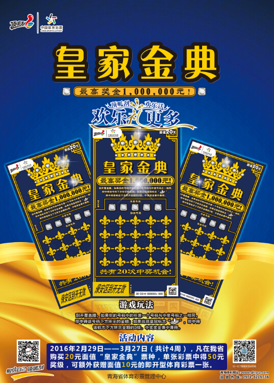 春回大地,万象更新,在这绿意盎然的时节,“顶呱刮”即开新票“皇家金典”伴随着春天的脚步将于2月29日走进我省各体彩销售网点,为我省彩民朋友带去更多不一样的刮奖体验。![]() 票面奢华 “皇家金典”是体彩顶呱刮一款财富主题即开票,奢华的蓝调搭配皇家御用黄,高贵典雅;璀璨的皇冠立于正中,20朵百合花饰点缀其中,高端大气。这是一款专为喜爱体彩顶呱刮的彩民朋友们量身打造的、具有典藏价值的高端即开票。“皇家金典”单张面值20元,最高奖金100万元。票面包含9个奖级,共有20次中奖机会,500元—5000元奖级众多,彰显大家风范。 玩法简单 刮开覆盖膜,如果你的号码中的任意一个号码与中奖号码之一相同,即中得该号码下方所示的金额;如果出现“皇冠”标志,即中得该标志下方所示金额的3倍。中奖奖金兼中兼得。 青海彩民刮“皇家金典”赢奖上奖 2月29日至3月27日,青海彩民凡在我省任意一家体彩销售网点购买顶呱刮“皇家金典”票种,单张彩票中得50元奖级,即可额外获赠面值10元的即开型体育彩票一张,让您惊喜不断!(张丽丽) |