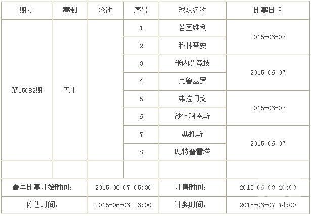 经研究,决定调整足球彩票4场进球游戏第15082期的计奖时间,由原定的6月7日10:00调整为6月7日14:00(具体附后),其竞猜对象、开售时间、停售时间和计奖时间均以本文为准。 附件.足球彩票4场进球游戏第15082期 国家体育总局体育彩票管理中心 二〇一五年六月一日 附件.足球彩票4场进球游戏第15082期