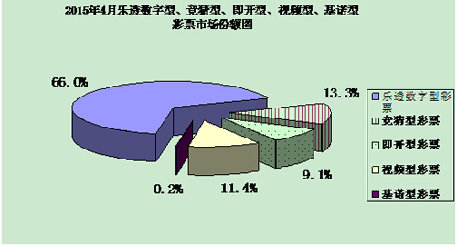 4月份,全国共销售彩票326.12亿元,比上年同期(简称“同比”)增加10.83亿元,增长3.4%。其中,福利彩票机构销售180.88亿元,同比增加3.86亿元,增长2.2%;体育彩票机构销售145.24亿元,同比增加6.97亿元,增长5.0%。 1月至4月累计,全国共销售彩票1274.47亿元,同比增加158.85亿元,增长14.2%。其中,福利彩票机构销售686.09亿元,同比增加45.70亿元,增长7.1%;体育彩票机构销售588.38亿元,同比增加113.15亿元,增长23.8%。 二、分类型彩票销售情况 4月份,乐透数字型彩票销售215.29亿元,同比增加3.68亿元,增长1.7%;竞猜型彩票销售43.21亿元,同比增加5.51亿元,增长14.6%;即开型彩票销售29.81亿元,同比减少4.38亿元,下降12.8%;视频型彩票销售37.20亿元,同比增加6.12亿元,增长19.7%;基诺型彩票[1]销售0.61亿元,同比减少0.10亿元,下降14.0%。4月份,乐透数字型、竞猜型、即开型、视频型、基诺型彩票销售量分别占彩票销售总量的66.0%、13.3%、9.1%、11.4%、0.2%。 1月至4月累计,乐透数字型彩票销售813.71亿元,同比增加62.36亿元,增长8.3%;竞猜型彩票销售210.91亿元,同比增加87.29亿元,增长70.6%;即开型彩票销售107.20亿元,同比减少16.45亿元,下降13.3%;视频型彩票销售140.64亿元,同比增加26.23亿元,增长22.9%;基诺型彩票销售2.01亿元,同比减少0.59亿元,下降22.9%。1-4月份乐透数字型、竞猜型、即开型、视频型和基诺型彩票销售量分别占彩票销售总量的63.8%、16.6%、8.4%、11.0%、0.2%。