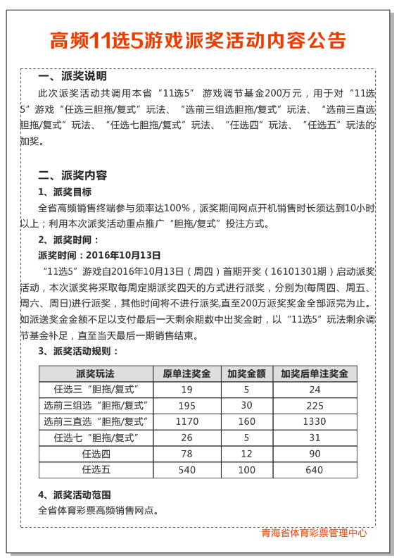 关于开展2016年度“11选5”游戏二次派奖活动的通知 中心各部、各服务中心、分中心、工作站: 根据青海省体育局《关于进一步加强体育彩票销售管理工作的意见》(青体【2015】21号)工作部署,为夯实体彩高频游戏市场基础,顺利完成“十三五”期间体育彩票销售规划目标,通过派奖的形式吸引和回馈广大购彩者,推广“11选5”游戏经典投注方式,达到宣传推广、扩大受众、促进销量的三重目的,现就有关事宜通知如下 : 一、领导小组 对活动整体策划、物品采购、宣传、兑奖监察、活动组织实施等方面进行全程监督指导。 组 长:张 宁 省体育局局长 副组长:宋爱军 省体育局办公室副主任 郭大忠 省体彩中心主任 赵景山 省体彩中心副主任 宋海平 省体彩中心主任编辑 组 员:冯一卓 省体彩中心业务部部长 郑 莉 省体彩中心财务部部长 田三民 省体彩中心综合部副部长 韩晓玉 省体彩中心综合部副部长 张丽娟 省体彩中心宣传部副部长 张义瑞 省体彩中心市场部代部长 韩朝虎 省体彩中心技术部副部长 吕 超 省体彩中心业务部副部长 活动办公室设在省体彩中心业务部,冯一卓任办公室主任,吕超、郑莉、田三民、韩晓玉、张丽娟、张义瑞、韩朝虎、苏燕、马萍梅、刘强、闵天文、王峰、王国栋、马琼、邓海涛、郑倩、杜鑫、谢倩为办公室成员。 二、活动实施小组及职责分工 为保障活动的顺利实施,特成立活动实施小组,负责执行活动的各项环节,明确人员分工。 宣传组组长:宋爱军 宣传组副组长:宋海平 宣传组组员:张丽娟、张丽丽、任尚德 宣传组职责:联系新闻媒体做好活动开始前的宣传预热工作;活动期间联系协调做好系列宣传工作;活动后期做好中奖的媒体宣传工作。 培训组组长:冯一卓 培训组组员:邓海涛、马琼、谢倩、杜鑫 培训组职责:负责派奖期间全程的培训工作,配合宣传组做好其他宣传工作。 检查组组长:赵景山 检查组组员:冯一卓、吕超、马琼、邓海涛、杜鑫、郑倩、张义瑞、张丽娟、张丽丽、刘强、闵天文、王峰、王国栋、苏燕、马萍梅 检查组职责:负责检查全省高频“11选5”网点内活动开展情况,督促业主及销售员加深对派奖活动内容理解。 三、几点要求: (一)高度重视。各跟踪巡查小组要高度重视此次派奖活动,根据本次检查内容制定详细的工作计划,认真加强督促检查。本次跟踪巡查结束后由各小组进行专题汇报巡查工作。 (二)责任到人。中心各部门、服务中心要根据本次活动内容责任到人,角色互补,确保各项工作有人可循,务必使各项跟踪巡查内容熟记于心。不能以任何理由推诿、拖沓,务必保持各项工作正常运行。 (三)分工明确。部门工作务必做到分工明确、保障有力、指导到位;业务部要简化工作程序,规范工作流程;宣传部媒体广告反应快捷、内容新颖、物料配送到位;技术部终端使用培训、开通、维修等工作细致有效;财务部结款、兑奖随时保证;综合部日常考勤、绩效考核严格、及时。 (四)狠抓落实。各部门、服务中心,要切实做好活动全程的跟进工作,配合各实施小组做好活动期间的各项工作落实,做到内容、标准、时间、效果四落实。 ![]() ![]() |