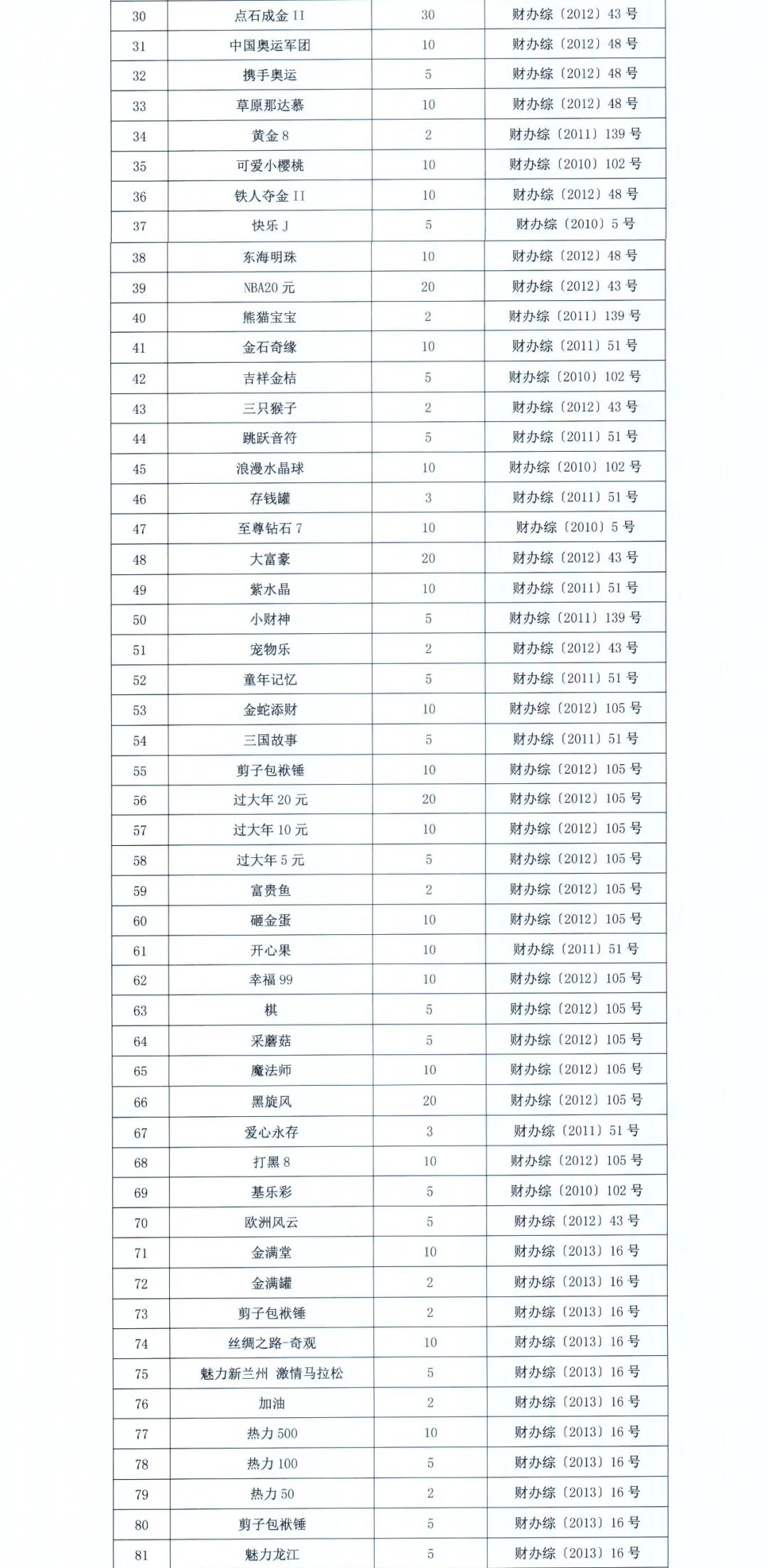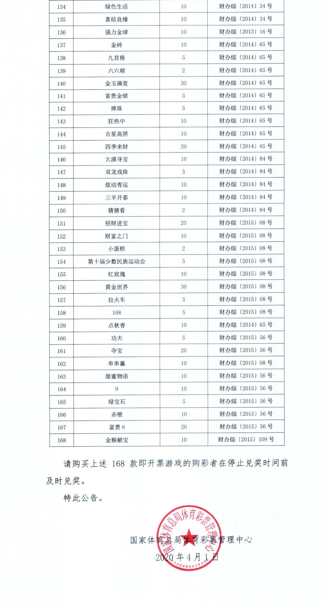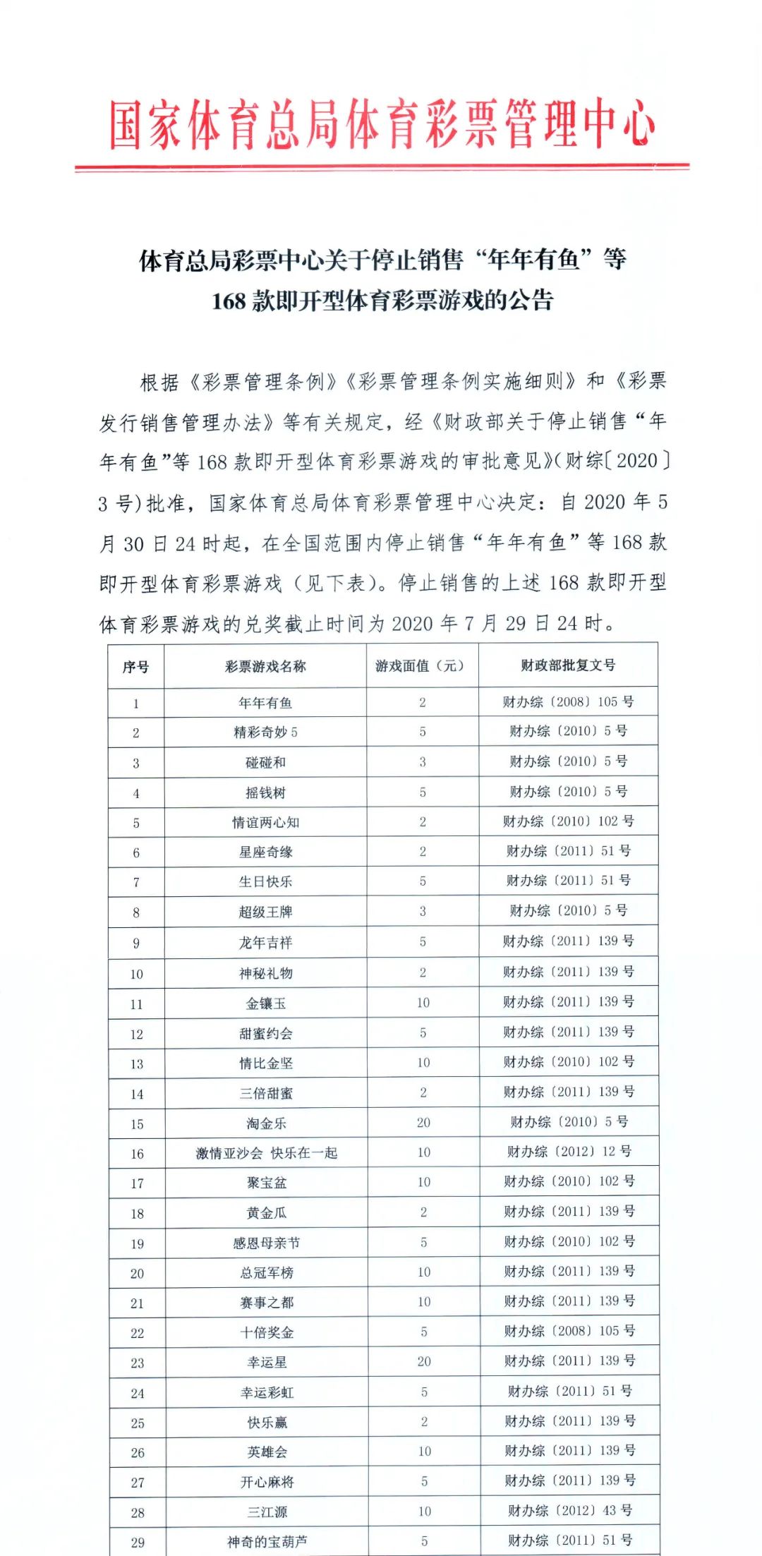 体育总局彩票中心关于停止销售“年年有鱼”等 168款即开型