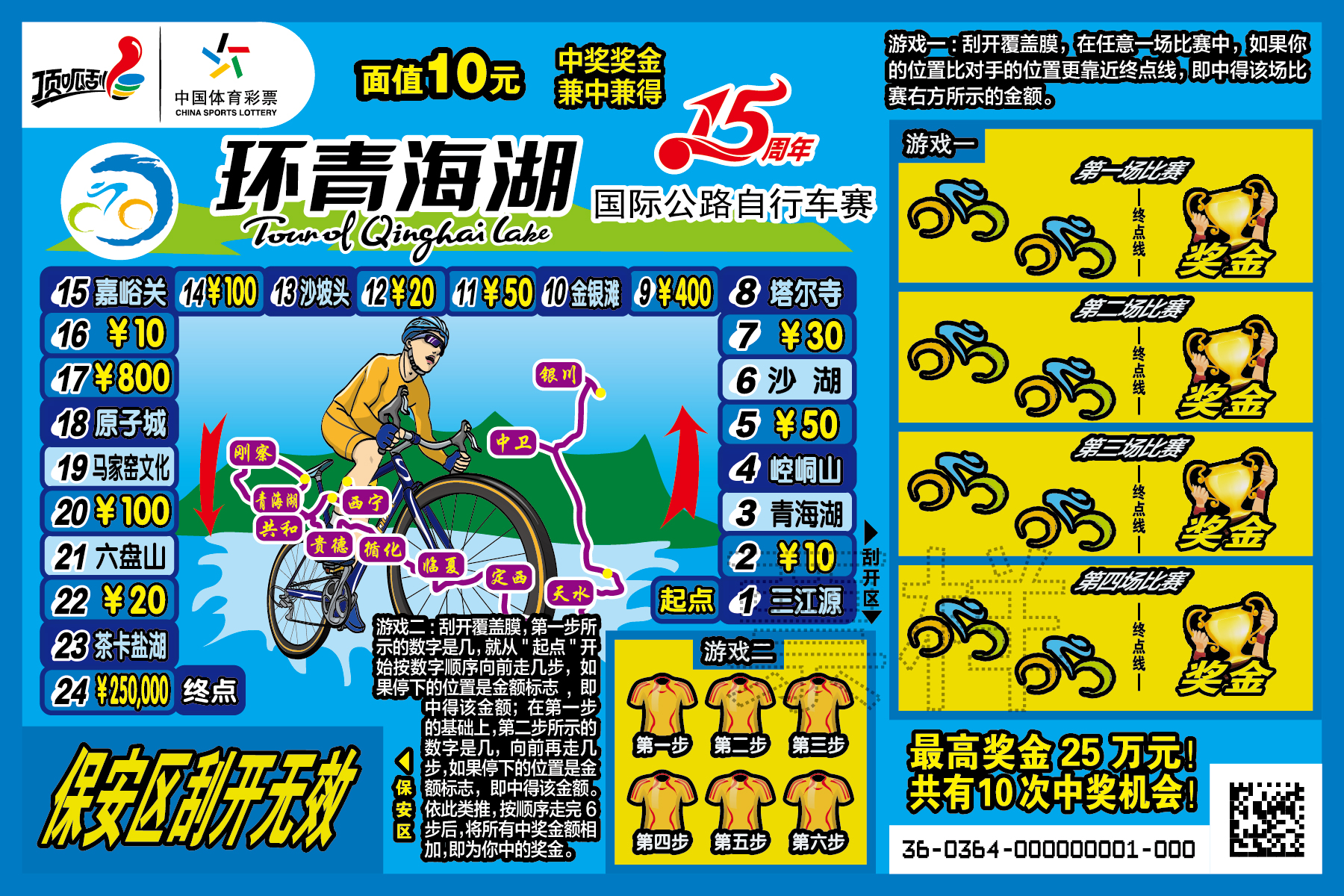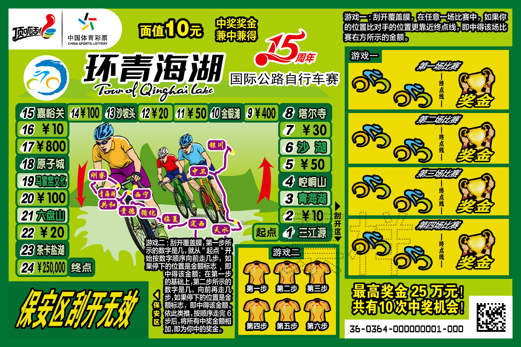 经国家体育总局和财政部批准,在青海省体育局的直接领导下,青海省体育彩票管理中心推出“环青海湖国际公路自行车赛•十五周年”主题即开型体育彩票。这是省体彩中心贯彻我省“十三五”规划,发行重大赛事体育彩票精神,为迎接第十五届环青海湖国际公路自行车赛而描绘的一笔绚丽风采。![]() ![]() ![]() ![]() ![]() 承载宣传 效果显著 “环湖赛•十五周年”主题即开型体育彩票将环湖赛这一国际著名公路自行车赛有机结合起来,并巧妙地把青甘宁三省(区)代表性的旅游景点串联在一起,使小小的一张彩票具有了宣传环湖赛文化,推介三地丰富的旅游文化资源的独特功能,是全国唯一一款将青甘宁三省(区)最具代表性的旅游景点印制在彩票票面上的即开型彩票。 设计精美 内涵丰富 “环湖赛•十五周年”主题即开型体育彩票共五枚,每张面值10元,共有10次中奖机会,最高奖金25万元。票面制作精美,设计新颖,以环湖赛比赛线路为背景,以公路自行车赛竞技特点为票面主要元素,把青甘宁的代表景点串联起来,展示了青甘宁优美的自然风光和人文风光,有着丰富的内涵。 玩法独特 乐趣无限 “环湖赛•十五周年”主题即开型体育彩票采用参照走步的游戏形式,玩法独特,乐趣无限。游戏一:刮开覆盖膜后,在任意一场竞赛中,如果你的位置比对手的位置更靠近终点线,即中得该场游戏右方所示的金额。游戏二:刮开覆盖膜,第一步所示的数字是几,就从“起点”开始按数字顺序向前走几步,如果停下的位置是金额标志,即中得该金额;在第一步的基础上,第二部所示的数字是几,向前再走几步,如果停下的位置是金额标志,即中得该金额。以此类推,按顺序走完六步后,将所有中奖金额相加,即为你中的奖金。 “环湖赛•十五周年”主题即开型体育彩票的上市发行是青海体育人共同为环湖赛的献礼。带着青海体彩人的祝福与助威,为第十五届环湖赛增姿添彩,向国内外参赛选手传播“公益体彩 乐善人生”的理念,展示“体育彩票 来之于民 用之于民”的宗旨,诠释“国家公益彩票”的职责。(张丽丽) |