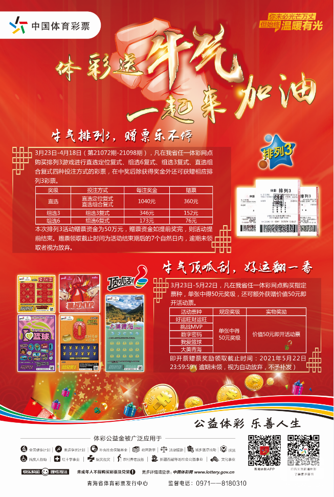 青海体彩“体彩送牛气 一起来加油”主题品牌营销活动今天正式开启啦!快来一睹活动详情吧! 惊喜1:牛气排列3,赠票乐不停。 3月23日-4月18日,凡在我省购买排列3游戏进行直选定位复式、组选6复式、组选3复式、直选组合复式四种投注方式的彩票,在中奖后除获得奖金外还可获赠相应排列3彩票。 此次赠票金额达50万元,若赠票资金如提前奖完,则活动提前结束;若赠票金额不足以支付最后一日赠票,则由活动保障金补足;活动截止时间内赠票金额还未赠完则活动截止。 惊喜2:牛气顶呱刮,好运翻一番。 3月23日-5月22日,凡在我省任一体彩网点购买5元面值“好运旺 财运旺”、“挑战MVP”;10元面值“数字密码” 、“我爱篮球”;20元面值“大美青海”五款即开产品,中得50元奖级的中奖票,除正常兑付中奖奖金外,还可额外获赠50元活动票。