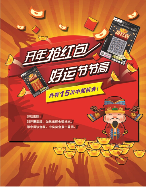 最近两年兴起的“抢红包”火遍大江南北,手机一族人人争抢红包,乐此不疲。体彩顶呱刮“抢红包”票面参考手机“抢红包”的设计,整个票面似足手机页面,大大的金元宝,15个排列整齐的红包等着你来刮开。 生肖票——“金猴献宝”