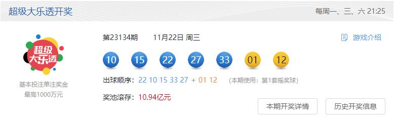 | 11月22日,体彩超级大乐透第23134期前区开出号码“10、15、22、27、 33”,后区开出号码“01、12”。本期全国销量为3.26亿元,为国家筹集彩票公益金1.17亿元。