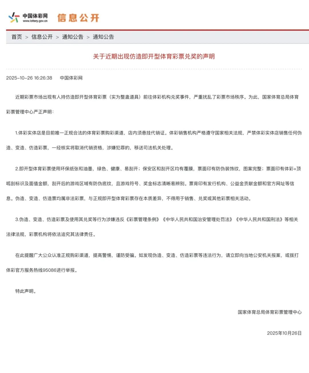 10月28日,央视《朝闻天下》栏目报道了一则关乎每位购彩者切身利益的重要新闻——国家体彩中心正式发布了《关于近期出现仿造即开型体育彩票兑奖的声明》,揭示了近期彩票市场上有不法分子利用仿造的即开型体育彩票(实为整蛊道具)试图在体彩机构进行兑奖,此举不仅严重扰乱了正常的彩票市场秩序,也对广大购彩者的权益构成了潜在威胁。 ![]() 节目中,国家体彩中心特别提醒公众,体彩实体店是目前唯一正规合法的体育彩票购彩渠道,而且店内悬挂代销证。正规的即开型体育彩票采用环保纸张和油墨,绿色、健康且易刮开;保安区和刮开区均有覆膜,票面印有防伪装饰纹,图案完整无缺;票面上清晰印有体彩+顶呱刮标识及面值金额,刮开后的游戏区域有防伪底纹,且游戏符号、奖金标志清晰易辨;票背还印有发行机构、公益金贡献金额和官方网址等重要信息。 需要强调的是,伪造、变造、仿造彩票及使用其兑奖等行为,绝非小事,而是涉嫌违反《彩票管理条例》《中华人民共和国治安管理处罚法》《中华人民共和国刑法》等相关法律法规。国家体彩中心对于此类违法行为,将依法追究其法律责任。 ![]() 在此,国家体彩中心呼吁广大民众,一旦发现伪造、变造、仿造彩票等违法行为,立即向当地公安机关报案,或通过拨打体彩官方服务热线95086进行举报。 彩票市场健康发展,关乎每一位购彩者的切身利益,也关乎社会的公平正义与和谐稳定。让我们携手共进,提高警惕,远离仿造彩票,共同营造一个规范、有序、健康的彩票市场环境,让彩票成为传递正能量、促进社会和谐的积极力量。 |