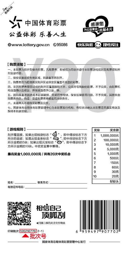 根据《彩票发行销售管理办法》的有关规定,2021年印刷批次的即开型体育彩票自2026年1月1日0时起停止销售,2026年3月3日0时起停止兑奖(根据《彩票管理条例》等彩票法规、彩票市场休市安排公告及各游戏规则等相关规定,兑奖截止日为《全国年节及纪念日放假办法》规定的全体公民放假的节日或者彩票市场休市的,兑奖截止日期按照彩票休市相关要求顺延,具体以体彩机构发布信息为准。)。 本次停止销售的即开型体育彩票内容如下表: 序号 | 批次号 | 彩票游戏名称 | 游戏面值(元) | 1 | 120210520 | 点石成金 | 20 | 2 | 120210541 | 国宝 | 20 | 3 | 120210603 | 甜蜜蜜 | 5 | 4 | 120210637 | 锦鲤 | 20 | 5 | 120210651 | 十倍幸运 | 10 | 6 | 120210656 | 7 | 20 | 7 | 120210657 | 点石成金 | 20 | 8 | 120210663 | 出7制胜 | 10 | 9 | 120210665 | 国宝 | 20 | 10 | 120210668 | 锦鲤 | 20 | 11 | 120210677 | 中国龙 | 50 | 12 | 120210692 | 妙 | 5 | 13 | 120210703 | 中国红 | 20 | 14 | 120210704 | 中国红 | 10 | 15 | 120210732 | 十倍幸运 | 10 | 16 | 120210735 | 中国红 | 10 | 17 | 120210736 | 三重钻石 | 10 | 18 | 120210737 | 红宝石8 | 10 | 19 | 120210739 | 麻辣6 | 5 | 20 | 120210740 | 中国红 | 5 | 21 | 120210758 | 红都瑞金 | 10 | 22 | 120210768 | 出7制胜 | 10 | 23 | 120210769 | 好彩头 | 10 | 24 | 120210770 | 好彩头 | 20 | 25 | 220210521 | 甜蜜蜜 | 5 | 26 | 220210522 | 麻辣6 | 5 | 27 | 220210523 | 7 | 20 | 28 | 220210525 | 点石成金 | 20 | 29 | 220210529 | 十倍幸运 | 10 | 30 | 220210565 | 中国红 | 20 | 31 | 220210566 | 中国红 | 10 | 32 | 220210567 | 中国红 | 5 | 33 | 220210576 | 锦鲤 | 10 | 34 | 220210602 | 中国红 | 10 | 35 | 220210606 | 中国红 | 5 | 36 | 220210609 | 红宝石8 | 10 | 37 | 220210610 | 三重钻石 | 10 | 38 | 220210612 | 十倍幸运 | 10 | 39 | 220210613 | 甜蜜蜜 | 5 | 40 | 220210614 | 麻辣6 | 5 | 41 | 220210634 | 五虎将 | 20 | 42 | 220210698 | 国宝 | 20 | 43 | 220210699 | 出7制胜 | 10 | 44 | 220210718 | 95至尊 | 30 | 45 | 220210720 | 火星计划 | 10 | 46 | 220210747 | 锦鲤 | 10 | 47 | 220210749 | 中国龙 | 50 | 48 | 220210753 | 好彩头 | 10 | 49 | 220210754 | 好彩头 | 20 |