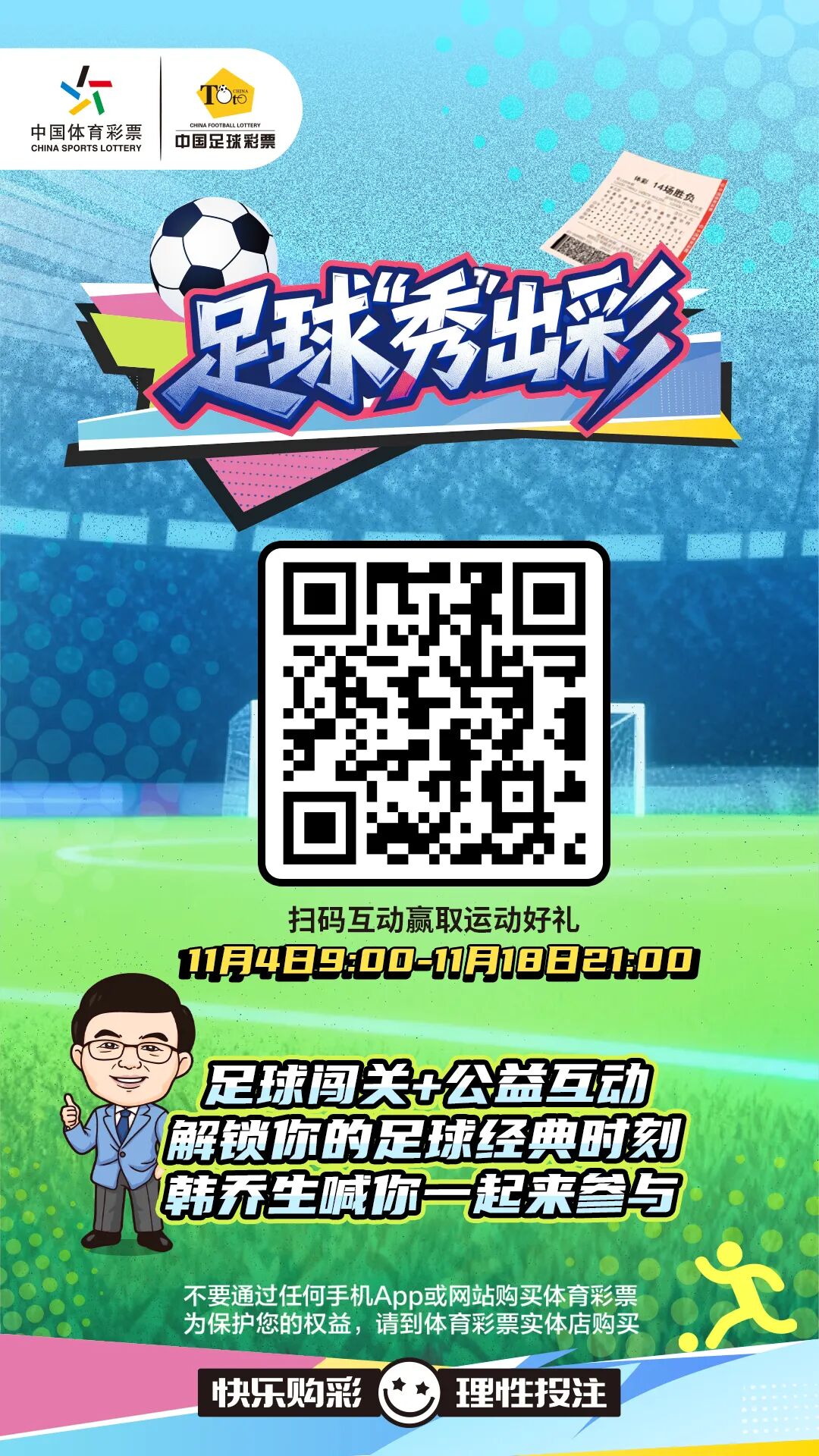“足球季”精彩开赛,欧洲五大联赛、欧冠赛事高潮迭起! 绿茵激情在线,岂能只做看客?体彩传统足彩倾情推出“足球‘秀’出彩,下一个经典由你创造”互动H5活动,给真球迷的专属福利! 加入挑战,趣味闯关,参与每日抽奖,赢取多重运动好礼,让你的热爱,每一次点击都创造价值! 轻松三步,秀出你的足球达人本色 本次活动为2025年11月4日9:00至11月18日21:00,你只需通过点击“阅读原文”活动链接或者微信扫描活动二维码,即可参与活动开启闯关之旅!   第一关:足球练习赛——挑战你的足球知识储备!从擅长的题库中答题,5次机会,答对3次即可通过,无论新老球迷都能尽情展现智慧。 第二关:体彩加油站——探索公益背后的温暖故事!带你了解体彩的公益足迹,成功探索2条科普知识线索即顺利通过,感受体育彩票的社会温度。 第三关:体彩传足明星赛——操控萌趣“乐小星”驰骋绿茵,收集积分道具,每积满5分触发一道传统足彩游戏题目,答对继续闯关。5个回合全部完成,即成功通关! 三个部分全部完成即为通关,生成个人专属海报,秀出你的闯关战绩,分享足球高光时刻!   抽奖机会多多 每位用户每日最多拥有4次抽奖机会,闯关每天最多可获3次抽奖机会:在第三关中,答对1题得1次,答对2-3题得2次,答对4-5题得3次。保存并分享专属海报还可再获1次抽奖机会。 我们为你准备了定制足球、遮阳帽、运动包、体育视频会员卡等运动好礼,数量有限,先闯先得! 1.32亿元传足派奖同步进行,惊喜加码 与此同时,传统足彩1.32亿元派奖活动也在火热进行中,为你的观赛体验增添更多可能! 第一阶段——10月25日已启动,聚焦“6场半全场”和“4场进球”游戏,每期分别派奖20万元与100万元,玩法简单,新手也能轻松上手! 第二阶段——11月22日将开启,“14场胜负”与“任选9场”游戏每期各派奖600万元,持续9期,助你在精彩赛事中赢得更多惊喜! 本次系列活动以“乐享赛事,公益同行”为主题,旨在传递足球快乐与公益初心。传统足彩不仅是竞技的延伸,更是公众参与公益的重要途径。我们倡导理性参与,鼓励大家在享受足球魅力的同时,共同助力社会公益事业。 现在,扫描二维码,立即加入“足球‘秀’出彩,下一个经典由你创造”,秀出你的足球态度,创造属于你的精彩瞬间!    |