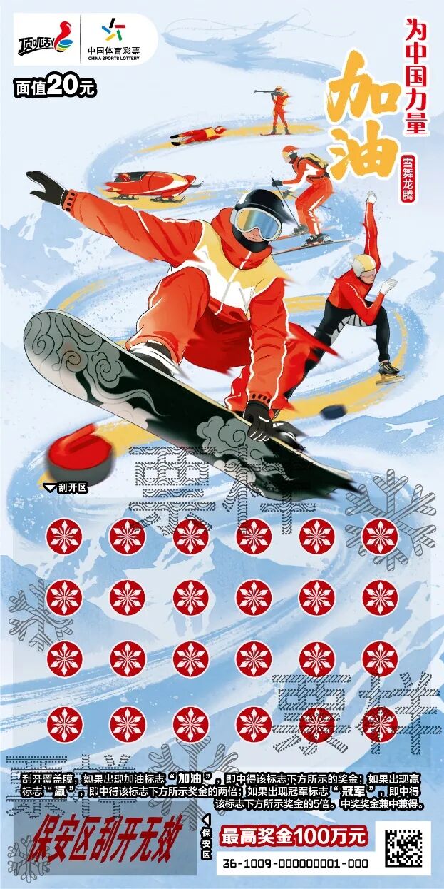 随着新年的脚步渐近 “新年登高祈好运”的传统情怀也在心中升腾 2026年冬奥会即将拉开序幕 为中国健儿呐喊助威的热血已然沸腾 此刻,体彩顶呱刮 推出两款全新即开票 “为中国力量加油 雪舞龙腾”与“步步登高” 传递冰雪竞技的激情与攀登向上的精神 既是传递祝福的新年好礼 更是连接公益与运动的暖心载体 让每一位购彩者在收获惊喜的同时 为体育事业添砖加瓦 冰雪之约,冬奥激情! 恰逢2026年冬奥会筹备关键时期 “为中国力量加油 雪舞龙腾”即开票重磅登场 以冰雪运动为核心主题 面值20元 共有1个票面场景 画面设计充满动感与张力 洁白的冰雪底色上 冬奥会运动项目的轨迹 划出灵动龙形线条 运动健儿矫健的身姿 与飞舞的雪花交织碰撞 既展现了冰雪运动的速度与美感 又融入了“龙”的文化图腾 每一张即开票不仅是传递 “为中国力量加油”心声的载体 更以体彩公益为纽带 让冰雪运动的魅力走进大众生活 推动全民上冰雪运动热潮持续升温 玩法规则: 刮开覆盖膜 如果出现加油标志 ![]() 即中得该标志下方所示的奖金 如果出现赢标志 ![]() 即中得该标志下方所示奖金的两倍 如果出现冠军标志 ![]() 即中得该标志下方所示奖金的5倍 中奖奖金兼中兼得 登高贺岁,共启新程!