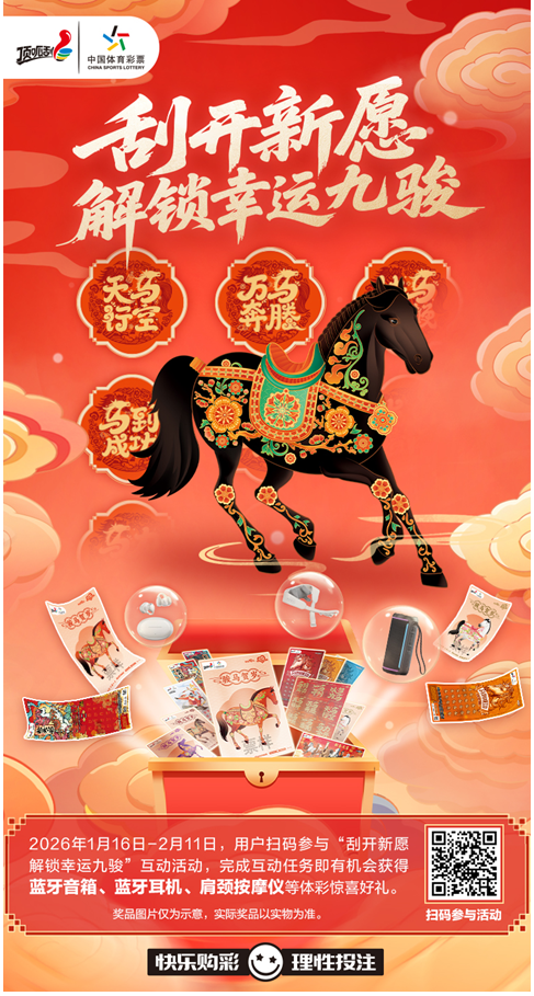 孩童挑选新衣的雀跃眼神里 藏着对新春的期待 大家念叨假期的碎碎念里 裹着对团圆的向往 街头巷尾悄然支起的对联摊位 故乡好友提前发来的新春邀约 这些藏在烟火细节里的年味 都在提醒我们 2026马年新春将至 一如既往,体彩新春季始终温暖相伴 六款新春即开票抢先登场 “午马”“骏马贺岁” “马到成功”“抢头彩2026” “新春大吉2026” “为中国力量加油 雪舞龙腾” 多种类型搭配丰富玩法 为新春提前注入欢乐因子 “刮开新愿 解锁幸运九骏”H5活动 也已悄然来到大家身边 加入这场新春狂欢 这款H5活动 精心设计9关趣味游戏 每一关都藏着独一无二的惊喜体验 为了让乐趣贯穿整个新春季 活动特别采用每三天解锁一关的模式 不同阶段都有新鲜体验加持 目前已经解锁三关 第一关的“天马行空” 让你脑洞大开,趣味十足 第二关的“万马奔腾” 考验你的即时记忆力 还有AR扫描功能 助你快速过关 最新解锁的第三关“快马加鞭” 快速点击为马儿加速 限时10s内跑出500米即可解锁 你可以任意选择进行挑战 极高的可选择度让参与感拉满 更令人心动的是 每天抽奖机会福利不停 蓝牙音箱、蓝牙耳机、肩颈按摩仪 便携餐具、咖啡杯等实用好物轮番派送 让幸运与喜悦常伴左右 活动持续至2月11日 后续还有多个关卡等待解锁 扫描下方二维码即可参与 为新春添满趣味与惊喜 ![]() 年味渐浓,幸运相伴 让我们跟随体彩的脚步 在忙碌的生活中稍作驻足 在趣味互动中收获满满快乐 肯定过去的每一次付出与努力 收拾心情积蓄前行力量 带着过往的收获与成长 一起“马上启新程” 奔赴更加精彩的2026! |