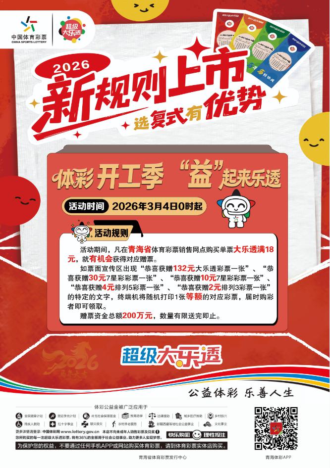 ![]() 春日启新程,体彩送好运!为进一步优化购彩体验、增添购彩娱乐趣味,真情回馈全省广大购彩者。 3月4日,青海体彩推出“体彩开工季 益起来乐透”主题活动,本次活动投入赠票资金总额200万元,各类赠票随机派发、数量有限,送完即止,为高原春日添上了一抹幸运亮色。 本次活动覆盖全省所有体育彩票销售网点,活动期间,购彩者在青海省内任意体彩销售网点购买超级大乐透单票满18元,即可自动参与随机赠票资格抽取。当购彩票面宣传区出现指定中奖文字时,销售终端将即时随机打印1张等额对应彩票,购彩者现场即可领取,让幸运惊喜即时兑现。 本次赠票设置五大类型,覆盖多款热门玩法:票面提示“恭喜获赠132元大乐透彩票一张”“恭喜获赠30元7星彩彩票一张”“恭喜获赠10元7星彩彩票一张”“恭喜获赠4元排列5彩票一张”“恭喜获赠2元排列3彩票一张”,均可现场兑领对应赠票,让购彩者在体验大乐透乐趣的同时,收获额外乐趣与惊喜。 作为国家公益彩票,青海体彩始终坚守“来之于民、用之于民”的发行宗旨,每一笔购彩资金都汇聚成体育彩票公益金,广泛用于全民健身场地建设、竞技体育备战、青少年体育发展、乡村振兴及社会公益保障等领域。此次开工季赠票活动,既是对购彩者的诚意回馈,也让公益理念融入日常购彩场景,以小彩票传递大温暖,让娱乐与公益同行。 活动全程遵循公开、公平、公正原则,具体规则以各销售网点现场公示为准。青海体彩也在此温馨提示,倡导广大购彩者理性购彩、量力而行,树立健康、文明、快乐的购彩观念,在享受活动乐趣的同时,坚守公益初心。 随着“体彩开工季 益起来乐透”活动全面启动,200万元赠票好礼已整装待发。期待全省购彩者走进身边的体彩网点,参与活动、收获幸运,与青海体彩一起在娱乐中传递公益力量。 |
