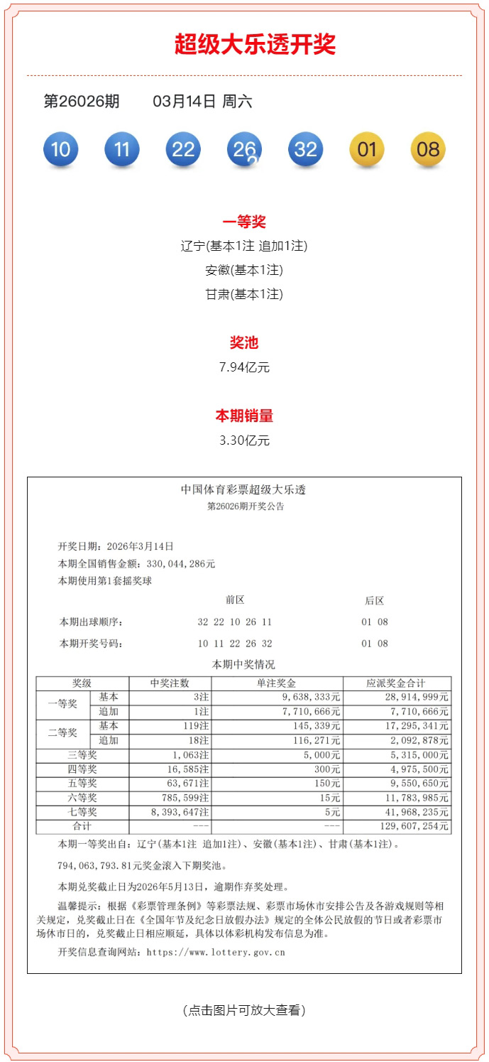 超级大乐透第26026期开奖公告