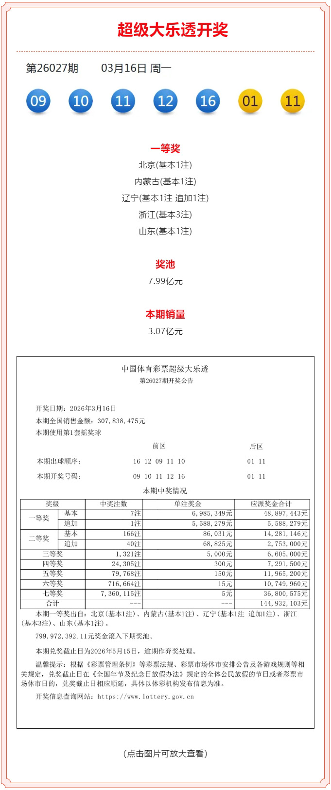 超级大乐透第26027期开奖公告