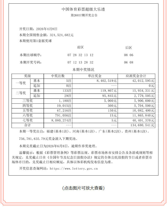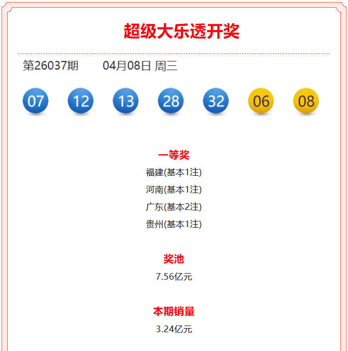 超级大乐透第26037期开奖公告