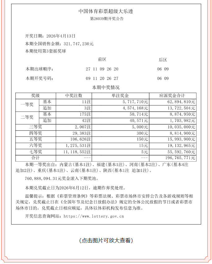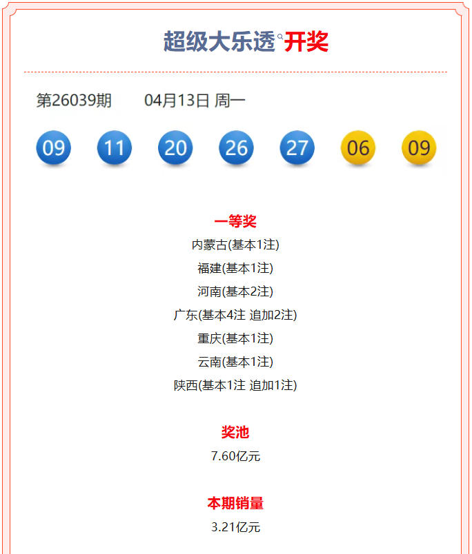 超级大乐透第26039期开奖公告