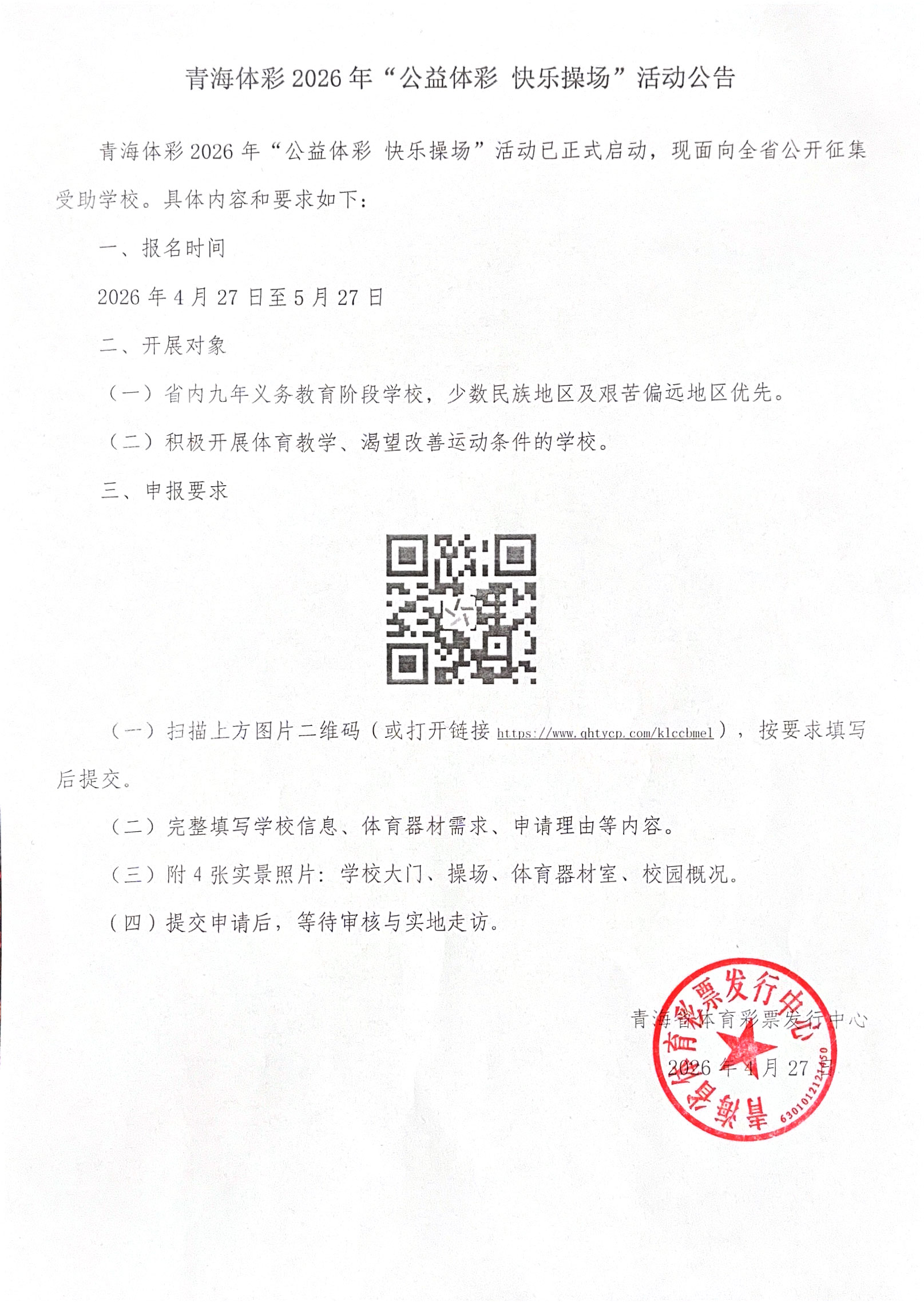 青海体彩2026年“公益体彩 快乐操场”活动已正式启动,现面向全省公开征集受助学校。具体内容和要求如下: 一、报名时间 2026年4月27日至5月27日 二、开展对象 (一)省内九年义务教育阶段学校,少数民族地区及艰苦偏远地区优先。 (二)积极开展体育教学、渴望改善运动条件的学校。 三、申报要求 ![]() (一)扫描上方图片二维码(或打开链接https://www.qhtycp.com/klccbmel),按要求填写后提交。 (二)完整填写学校信息、体育器材需求、申请理由等内容。 (三)附4张实景照片:学校大门、操场、体育器材室、校园概况。 (四)提交申请后,等待审核与实地走访。 青海省体育彩票发行中心 2026年4月27日 |